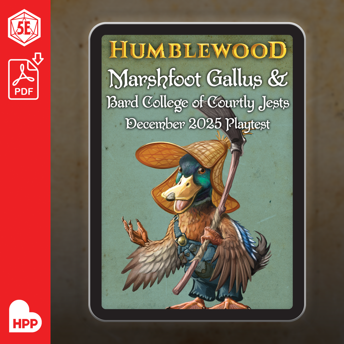 Discover a new Humblewood race, the waterfowl-inspired Marshfoot Gallus and a new subclass for the bard: the College of Courtly Jests!