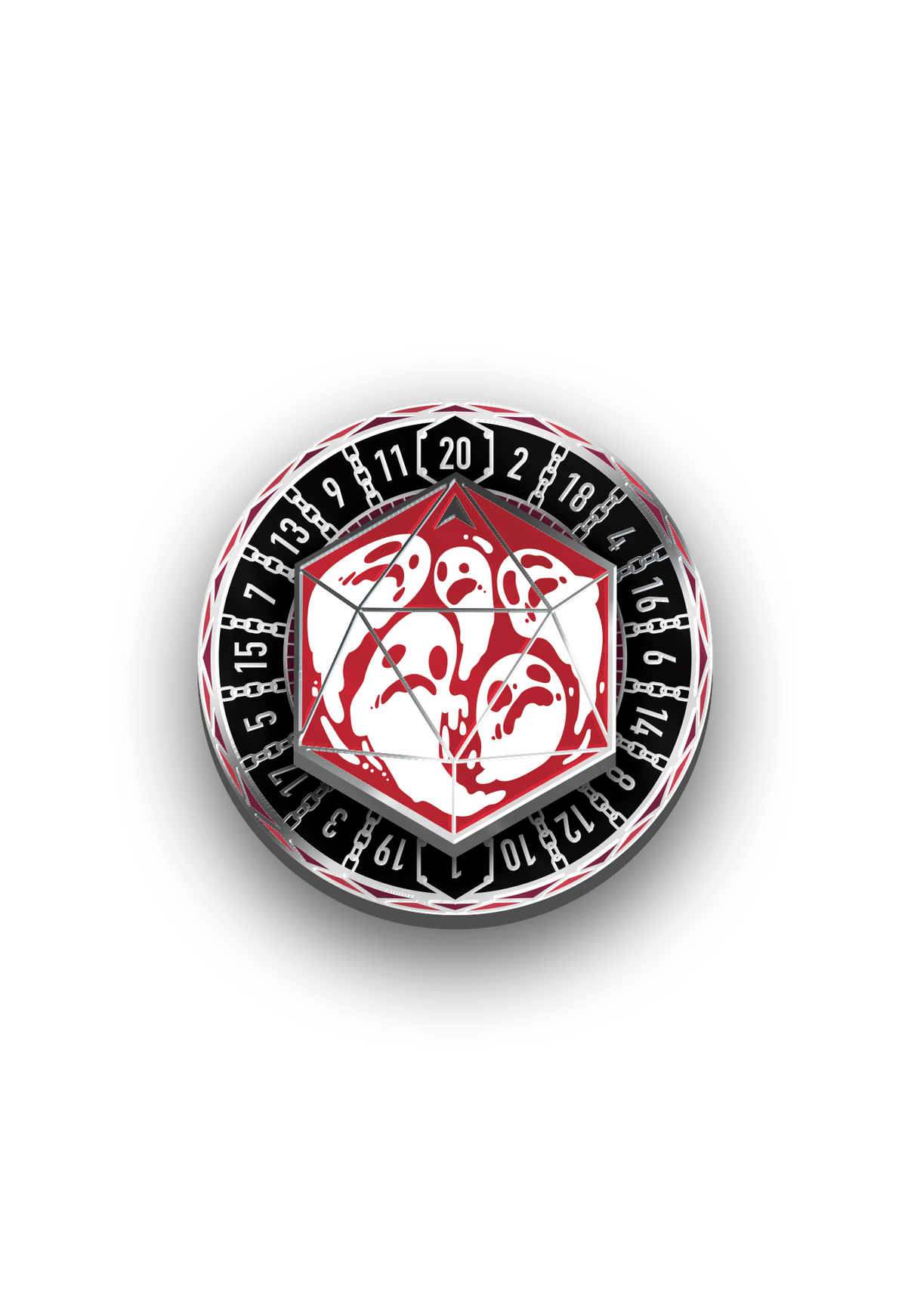 An enamel spinning pin inspired by the d20 shape from the Donjon card illustration by Yoshi Yoshitani in the Fablemaker's Deck of Many Things.