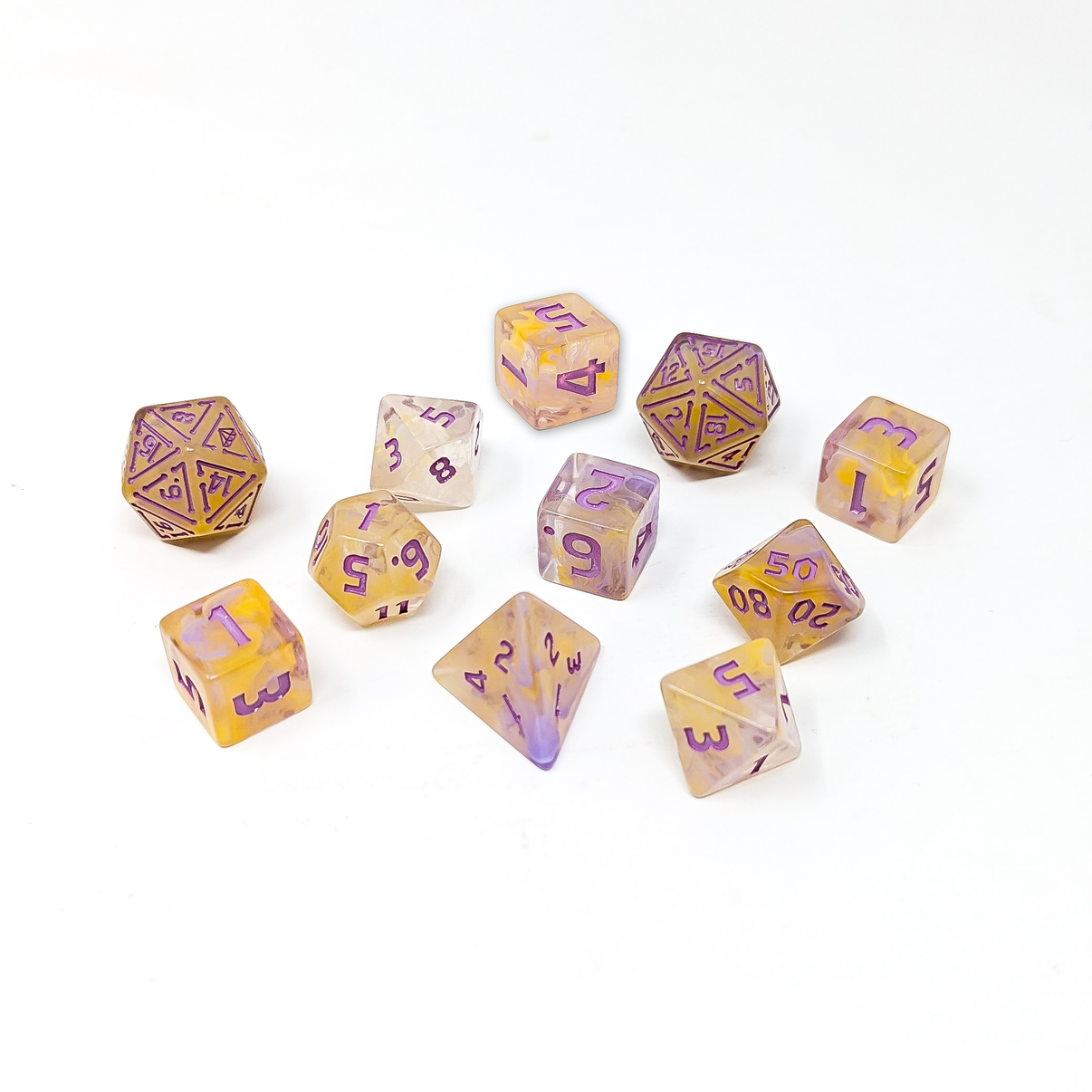 Clear swirled yellow and purple dice with foreclaimer-marked D20s.