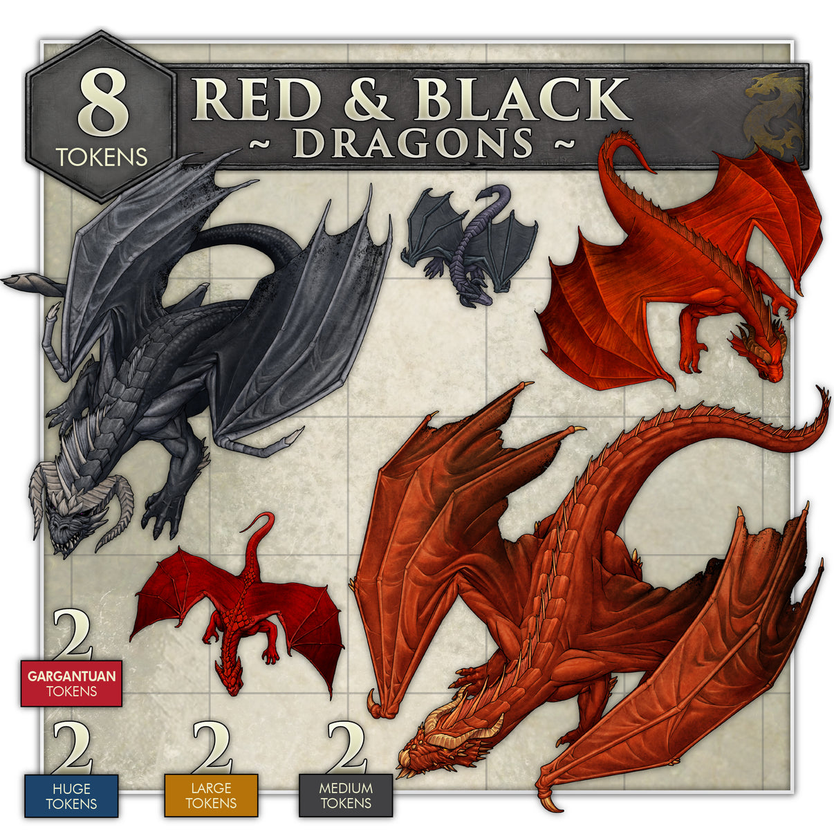 The Red & Black Dragons set includes 8 top-down tokens, each in three color variations, for use on your favorite VTT platform.Black Dragon Wyrmling, Red Dragon Wyrmling (medium)Young Black Dragon, Young Red Dragon (large)Adult Black Dragon, Adult Red Dragon (huge)Ancient Black Dragon, Ancient Red Dragon (gargantuan)