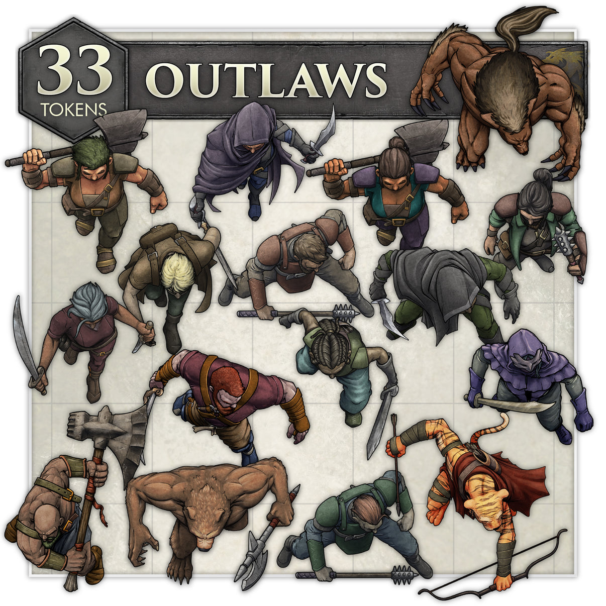 The Outlaws set includes 33 top-down digital tokens, each in three color variations, for use on your favorite VTT platform.Assassin, female, Assassin, male, Bandit Captain, female, Bandit Captain, male, Berserker, female x2, Berserker, male x2, Cult Fanatic, female x2, Cult Fanatic, male x2, Cultist, female x2, Cultist, male x2, Spy, female, Spy, male, Thug, female x2, Thug, male x3, Werebear x2, Wereboar x2, Wererat x2, Weretiger x2, Werewolf x2 (medium)