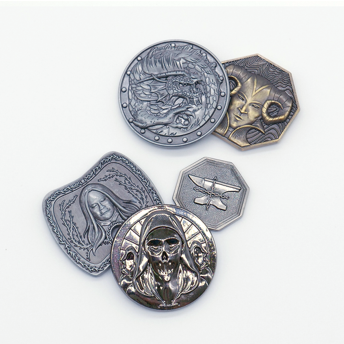Physical, minted versions of 5 magic items from Book One and Book Two, including the ferryman's take, fortune's fivepence, immovable button, shadow tag, and silver coin of Duvra. Shiny and magic!